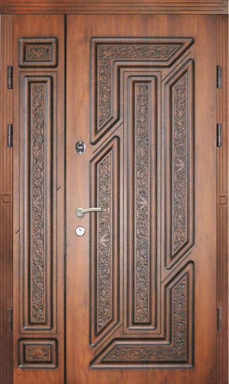 Поскольку в большинстве случаев устанавливаемые на входе в коттедж двустворчатые двери являются еще и предметом интерьера, украшающим здание, их дизайну предается особое значение. Эти двери, как правило, отделываются атмосферостойким МДФ, натуральным шпоном, массивом. Эффектно на таких дверях смотрится витражный узор, применение ковки, зеркальных элементов. Вариантов декора входной двустворчатой двери масса, тут все зависит от пожеланий заказчика.
