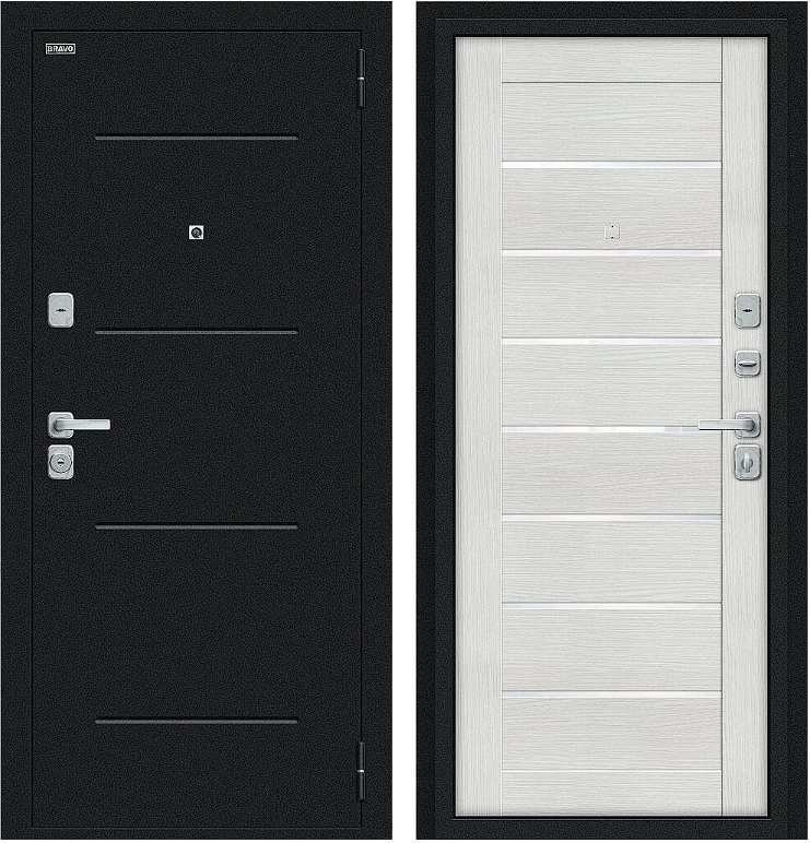 Надежная входная Дверь Браво Техно/BChrome Букле черное/Bianco Melinga премиум класса по цене 33 600 руб. Большая толщина стали защитит от проникновения в ваш дом, квартиру или коттедж. Используется очень качественная фурнитура: замки, цилиндры, ручки, защелки. Покрытие и отделка двери изготовлено под внимательным контролем производителя. Дверь имеет долгий срок службы и гарантию.